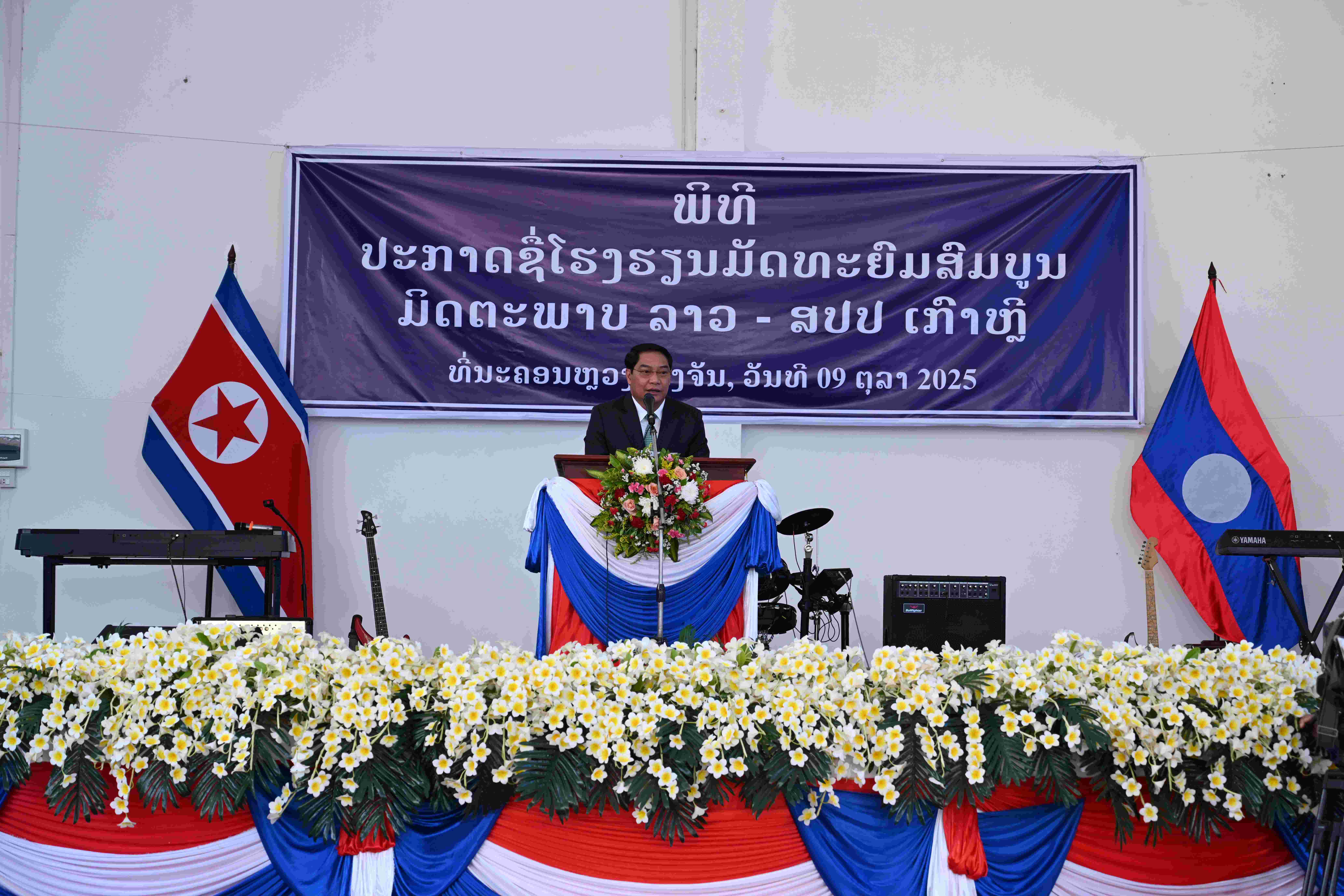ໃນພິທີນີ້, ໄດ້ມີການປະກາດຊື່ໂຮງຮຽນມັດທະຍົມສົມບູນມິດຕະພາບ ລາວ - ສປປ ເກົາຫຼີ ຢ່າງເປັນທາງການ, ເຊິ່ງສະຫາຍ ປອ. ອາດສະພັງທອງ ສີພັນດອນ, ໄດ້ໃຫ້ກຽດຂຶ້ນມີຄໍາເຫັນ ໂດຍຊີ້ໃຫ້ເຫັນເຖິງປະຫວັດຄວາມເປັນມາ, ການພັດທະນາໃນແຕ່ລະໄລຍະ ແລະ ຄວາມສໍາຄັນຂອງໂຮງຮຽນມິດຕະພາບ ລາວ - ສປປ ເກົາຫຼີ, ເຊິ່ງໂຮງຮຽນດັ່ງກ່າວ ແມ່ນເປັນສັນຍາລັກແຫ່ງການພົວພັນຮ່ວມມືລະຫວ່າງ ສະມາຄົມມິດຕະພາບ ລາວ - ສປປ ເກົາຫຼີ ແລະ ສປປ ເກົາຫຼີ - ລາວ ກໍຄືສາຍພົວພັນມິດຕະພາບ ແລະ ການຮ່ວມມືທີ່ເປັນມູນເຊື້ອລະຫວ່າງ ສອງພັກ, ສອງລັດ ແລະ ປະຊາຊົນສອງຊາດລາວ ແລະ ສປປ ເກົາຫຼີ ທີ່ໄດ້ສ້າງຕັ້ງຂຶ້ນບົນພື້ນຖານໄມຕິຈິດມິດຕະພາບ ແລະ ການຮ່ວມມື ເພື່ອປະຕິບັດພາລະກິດສັງຄົມນິຍົມ ແລະ ເຊື່ອໝັ້ນວ່າໂຮງຮຽນແຫ່ງນີ້ ຈະໄດ້ຮັບການປັນປຸງໃຫ້ເປັນໂຮງຮຽນທີ່ທັນສະ ໄໝຢ່າງຮອດດ້ານໃນອະນາຄົດ.