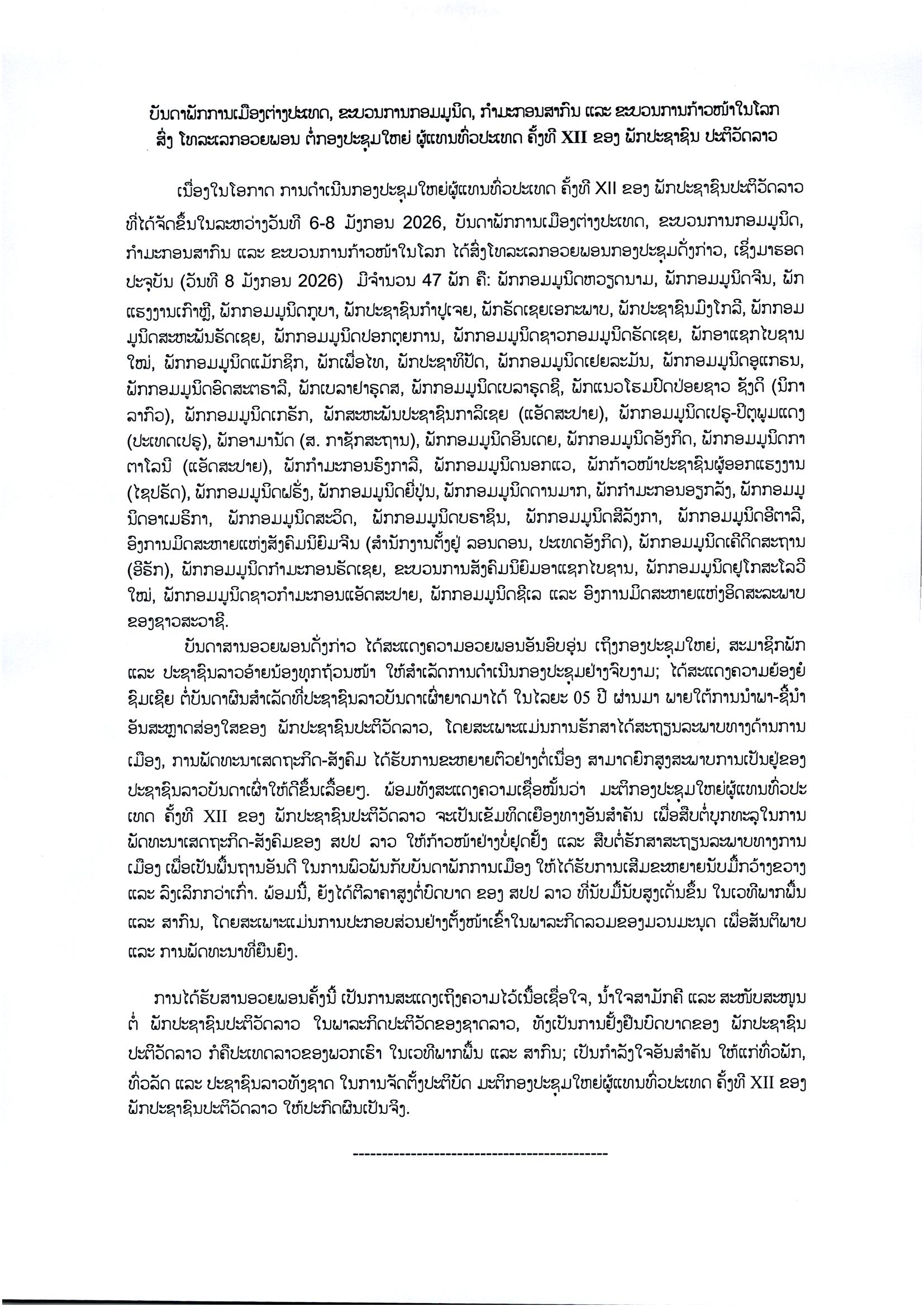 ບັນດາພັກການເມືອງຕ່າງປະເທດ, ຂະບວນການກອມມູນິດ, ກຳມະກອນສາກົນ ແລະ ຂະບວນການກ້າວໜ້າໃນໂລກ ສົ່ງ ໂທລະເລກອວຍພອນ ຕໍ່ກອງປະຊຸມໃຫຍ່ ຜູ້ແທນທົ່ວປະເທດ ຄັ້ງທີ XII ຂອງ ພັກປະຊາຊົນ ປະຕິວັດລາວ