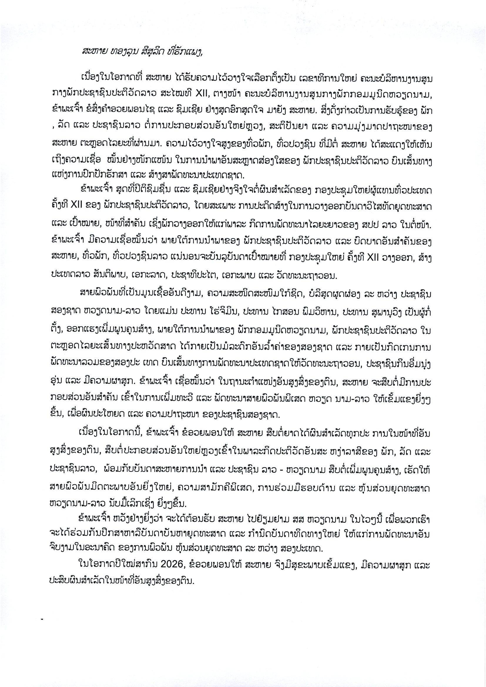 ສະຫາຍ ໂຕ ເລິມ ເລຂາທິການໃຫຍ່ຄະນະບໍລິຫານງານສູນກາງພັກກອມມູນິດຫວຽດນາມ ສົ່ງສານຊໍົມເຊີຍ ສະຫາຍ ທອງລຸນ ສີສຸລິດ