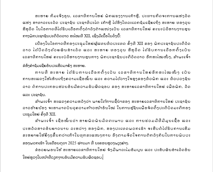 ສະຫາຍ ກິມເຈິງອຸນ ສົ່ງສານຊົມເຊີຍ ເຖິງ ສະຫາຍ ທອງລຸນ ສີສຸລິດ