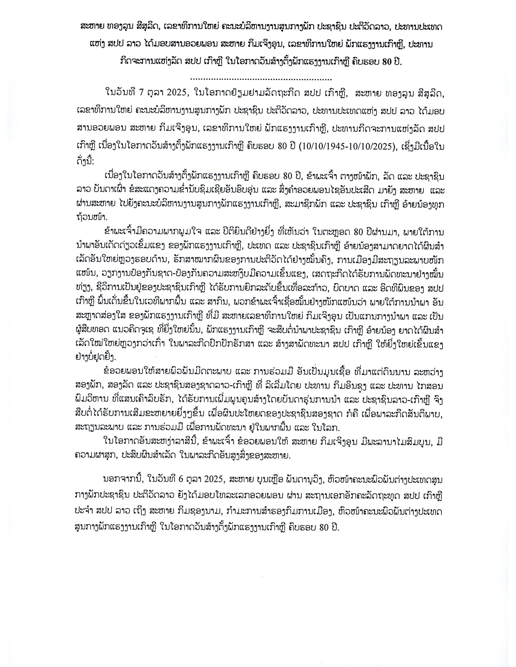 ເຜີຍແຜ່ໂດຍ: moderator ເວລາ: 09/10/2025 08:35:40 ຈຳນວນຢ້ຽມຊົມ 49 ຄັ້ງ ສະຫາຍ ທອງລຸນ ສີສຸລິດ, ເລຂາທິການໃຫຍ່ ຄະນະບໍລິຫານງານສູນກາງພັກ ປະຊາຊົນ ປະຕິວັດລາວ, ປະທານປະເທດແຫ່ງ ສປປ ລາວ ໄດ້ມອບສານອວຍພອນ ສະຫາຍ ກິມເຈິງອຸນ, ເລຂາທິການໃຫຍ່ ພັກແຮງງານເກົາຫຼີ, ປະທານກິດຈະການແຫ່ງລັດ ສປປ ເກົາຫຼີ ໃນໂອກາດວັນສ້າງຕັ້ງພັກແຮງງານເກົາຫຼີ ຄົບຮອບ 80 ປີ.