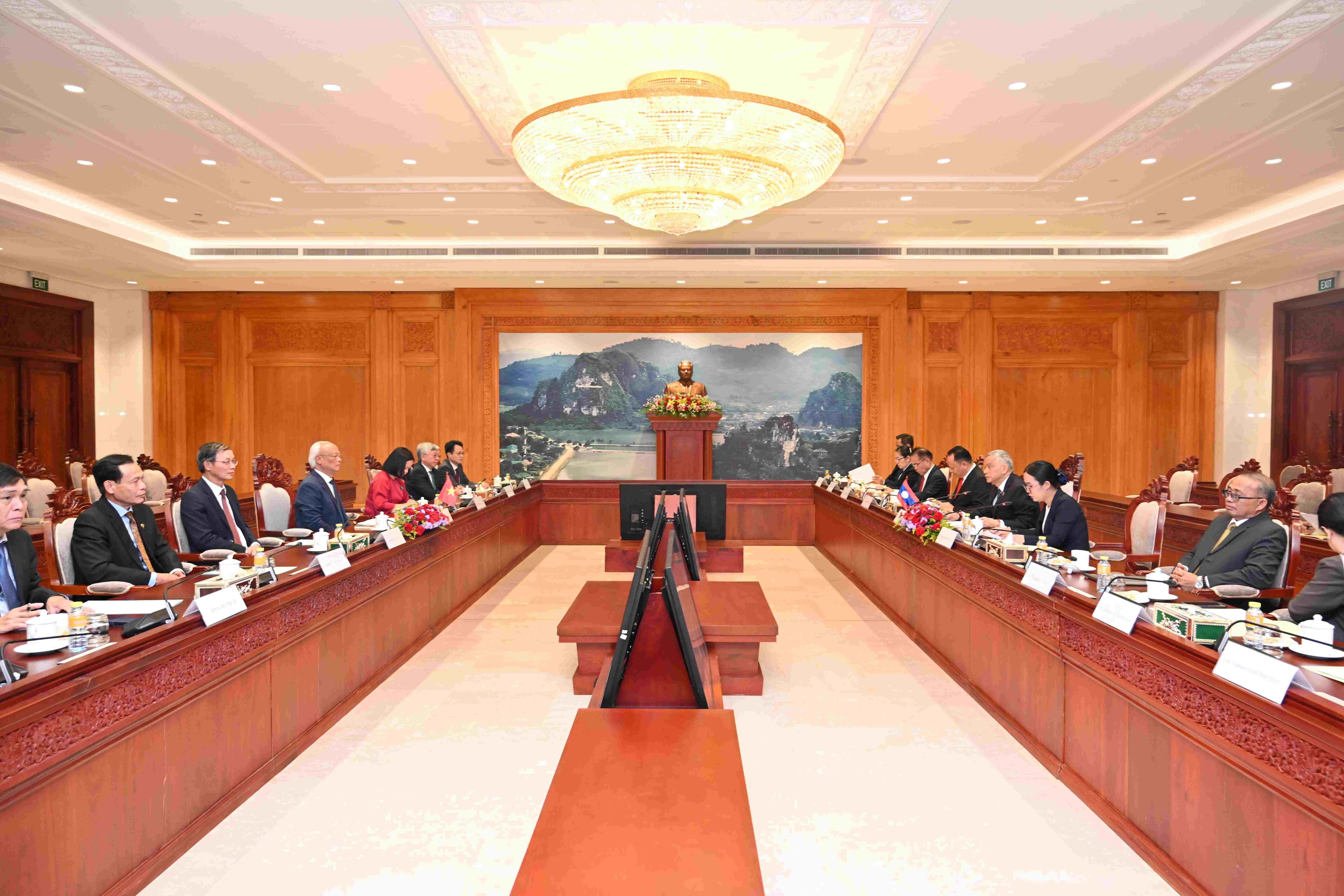 ໃນວັນທີ 9 ທັນວາ 2025, ຄະນະຜູ້ແທນສັນຕິພາບ ຫວຽດນາມ ໄດ້ເຂົ້າຢ້ຽມຂໍ່ານັບ ສະຫາຍ ບຸນທອງ ຈິດມະນີ, ກໍາມະການກົມການເມືອງສູນກາງພັກພັກ, ຜູ້ປະຈໍາການຄະນະເລຂາທິການສູນກາງພັກ, ຮອງປະທານປະ ເທດ. ສະຫາຍ ບຸນທອງ ຈິດມະນີ ໄດ້ສະແດງຄວາມຕ້ອນຮັບຢ່າງອົບອຸ່ນ ແລະ ຕີລາຄາສູງຕໍ່ການຢ້ຽມຢາມ ແລະ ເຮັດວຽກຢູ່ ສປປ ລາວຂອງຄະນະຜູ້ແທນຄະນະສັນຕິພາບ ຫວຽດນາມ ຖືເປັນການປະກອບສໍາຄັນສ່ວນເຂົ້າ ໃນການ ເສີມຂະຫຍາຍ ແລະ ເພີ່ມພູນຄູນສ້າງສາຍພົວພັນ ລາວ-ຫວຽດນາມ. ສອງຝ່າຍ ໄດ້ຕີລາຄາສູງ ຕໍ່ສາຍພົວພັນມິດ ຕະພາບ, ຄວາມສາມັກຄີພິເສດ ແລະ ການຮ່ວມມືຮອບດ້ານ ລະຫວ່າງສອງພັກ, ສອງລັດ ແລະ ປະຊາຊົນ ສອງຊາດ ລາວ - ຫວຽດນາມ ທີ່ນັບມື້ໄດ້ຮັບການເສີມຂະຫຍາຍທັງທາງກ້ວາງ ແລະ ລວງເລິກ ແລະ ນໍາເອົາຜົນປະ ໂຫຍດຕົວຈິງມາສູ່ປະຊາຊົນສອງຊາດ. ພ້ອມນັ້ນ, ຍັງໄດ້ຕີລາຄາສູງຕໍ່ການພົວພັນຮ່ວມມື ລະຫວ່າງ ຄະນະສັນຕິ ພາບສອງຝ່າຍ ທີ່ມີກົນໄກການພົວພັນຮ່ວມມື, ປະສານງານ, ຖອດຖອນບົດຮຽນນຳກັນ, ແລກປ່ຽນຂໍ້ມູນຂ່າວສານ, ແລກປ່ຽນທັດສະນະ ແລະ ສະໜັບສະໜູນເຊິ່ງກັນ ແລະ ກັນໃນ ໃນເວທີພາກພື້ນ ແລະ ສາກົນ, ເຊິ່່ງເປັນການປະ ກອບສ່ວນສ້າງສະພາບແວດລ້ອມໃນພາລະກິດສັນຕິພາບ, ມິດຕະພາບ ແລະ ການຮ່ວມມື ໃນພາກພື້ນ ແລະ ສາກົນ. ສ່ວນ ສະຫາຍ ອວງຈູລຶວ ໄດ້ສະແດງຄວາມຂອບໃຈຕໍ່ການຕ້ອນຮັບອັນອົບອຸ່ນ ແລະ ແຈ້ງໃຫ້ຊາບຈຸດປະສົງຂອງ ການມາຢ້ຽມຢາມ ສປປ ລາວ ແລະ ການເຄື່ອນໄຫວໂດຍຫຍໍ້ ຂອງ ຄະນະສັນຕິພາບ ຫວຽດນາມ.
