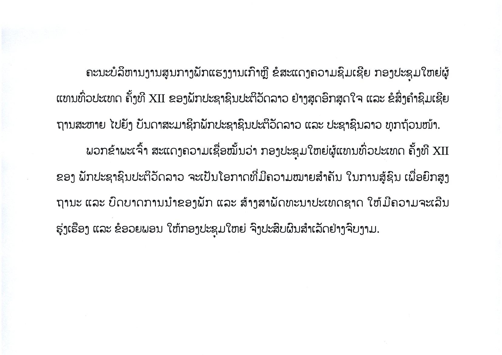 ຄະນະບໍລິຫານງານສູນກາງພັກແຮງງານເກົາຫຼີ ສົ່ງສານອວຍພອນ ເຖິງກອງປະຊຸມໃຫຍ່ຜູ້ແທນທົ່ວປະເທດ ຄັ້ງທີ XII ຂອງພັກປະຊາຊົນປະຕິວັດລາວ.
