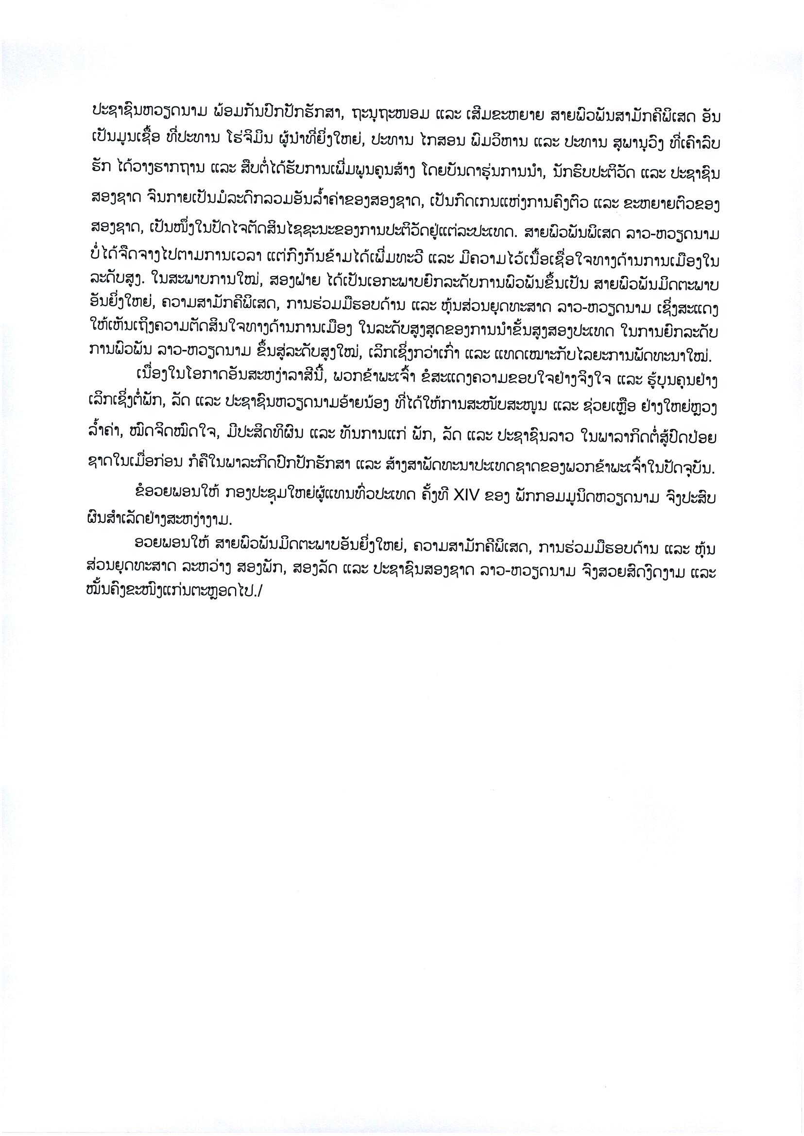 ຄະນະບໍລິຫານງານສູນກາງພັກປະຊາຊົນປະຕິວັດລາວ ສົ່ງສານອວຍພອນ ກອງປະຊຸມໃຫຍ່ຜູ້ແທນທົ່ວປະເທດ ຄັ້ງທີ XIV ຂອງ ພັກກອມມູນິດຫວຽດນາມ