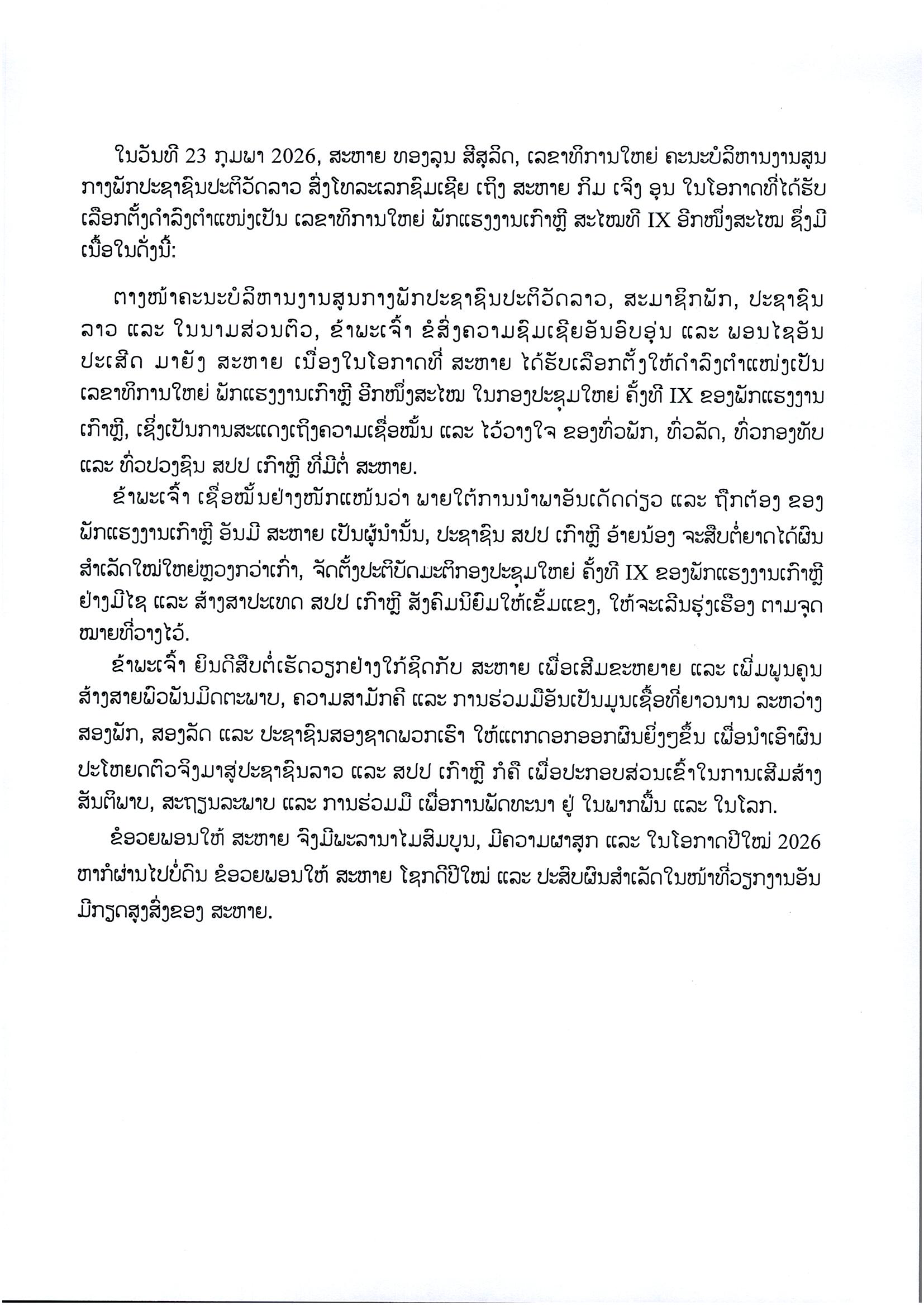 ຄະນະບໍລິຫານງານສູນກາງພັກ ປະຊາຊົນປະຕິວັດລາວ ສົ່ງສານອວຍພອນ ກອງປະຊຸມໃຫຍ່ ຄັ້ງທີ IX ຂອງ ພັກແຮງງານເກົາຫຼີ.