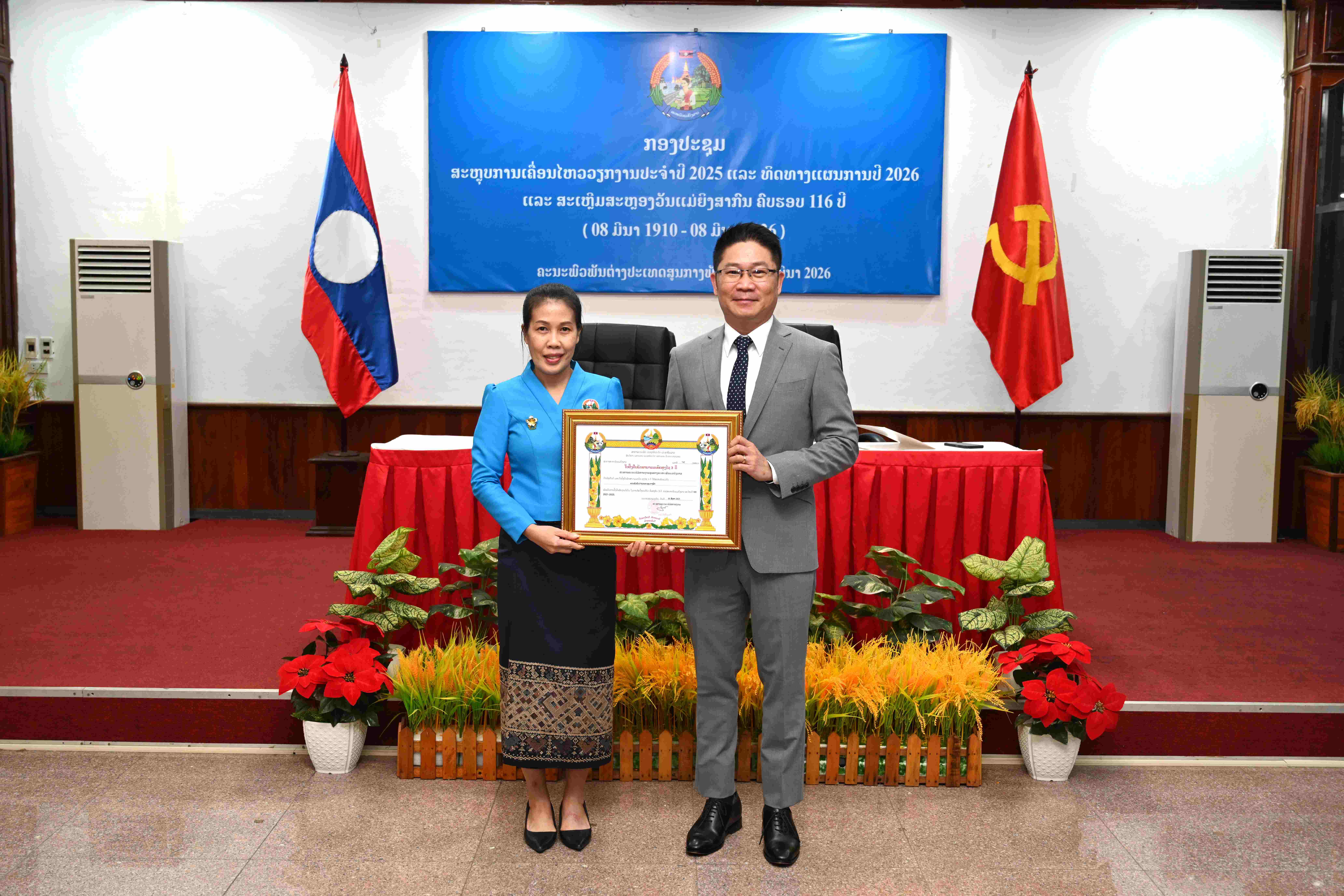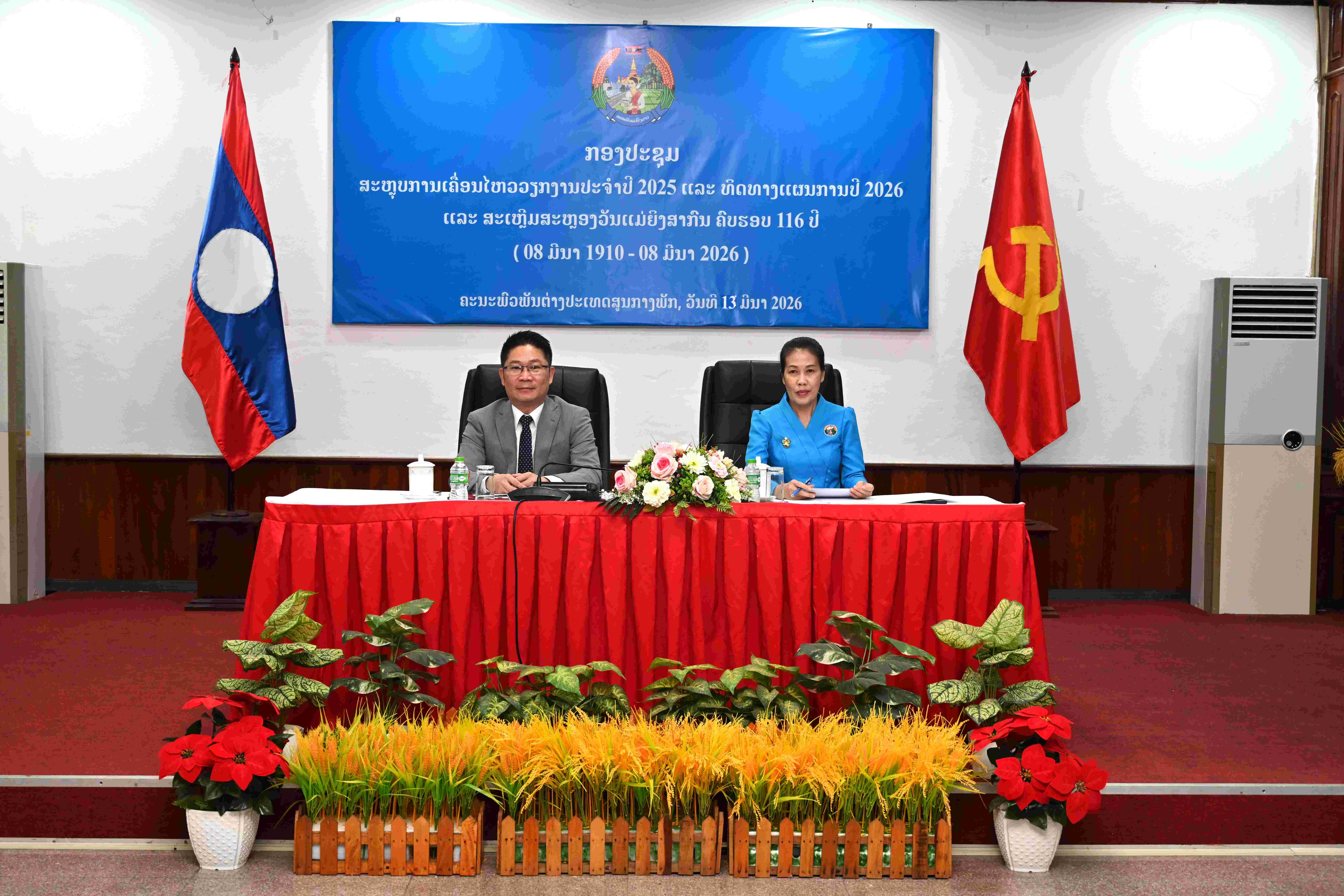 ເຜີຍແຜ່ໂດຍ: moderator ເວລາ: 17/03/2026 15:27:41 ຈຳນວນຢ້ຽມຊົມ 18 ຄັ້ງ ໃນວັນທີ 13 ມີນາ 2026, ສະຫະພັນແມ່ຍິງຄະນະພົວພັນຕ່າງປະເທດສູນກາງພັກ ໄດ້ຈັດກອງປະຊຸມສະຫຼຸບການເຄື່ອນໄຫວວຽກງານປະຈໍາປີ 2025 ແລະ ວາງແຜນທິດທາງປີ 2026, ແລະ ສະເຫຼີມສະຫຼອງວັນແມ່ຍິງສາກົນ ຄົບຮອບ 116 ປີ. ໃຫ້ກຽດເປັນປະທານ ໂດຍ ສະຫາຍ ປອ ວາລະໄຊ ເລັ່ງສະຫວັດ, ກໍາມະການສໍາຮອງສູນກາງພັກ, ຮອງເລຂາຄະນະບໍລິຫານງານພັກ, ຮອງຫົວໜ້າຄະນະພົວພັນຕ່າງປະເທດສູນກາງພັກ, ຜູ້ຊີ້ນໍາວຽກງານອົງການຈັດຕັ້ງມະຫາຊົນ ແລະ ສະຫາຍ ນາງ ສຸກສະຫວັນ ແກ້ວວິໄລວັນ, ປະທານສະຫະພັນແມ່ຍິງຄະນະພົວພັນຕ່າງປະເທດສູນກາງພັກ, ມີບັນດາສະຫາຍຄະນະບໍລິຫານງານສະຫະພັນແມ່ຍິງ, ຕາງໜ້າສະຫະພັນກໍາມະບານ ແລະ ຊາວໜຸ່ມ, ພ້ອມດ້ວຍສະມາຊິກຂອງ ສາມອົງການຈັດຕັ້ງມະຫາຊົນ ເຂົ້າຮ່ວມຢ່າງພ້ອມພຽງ.