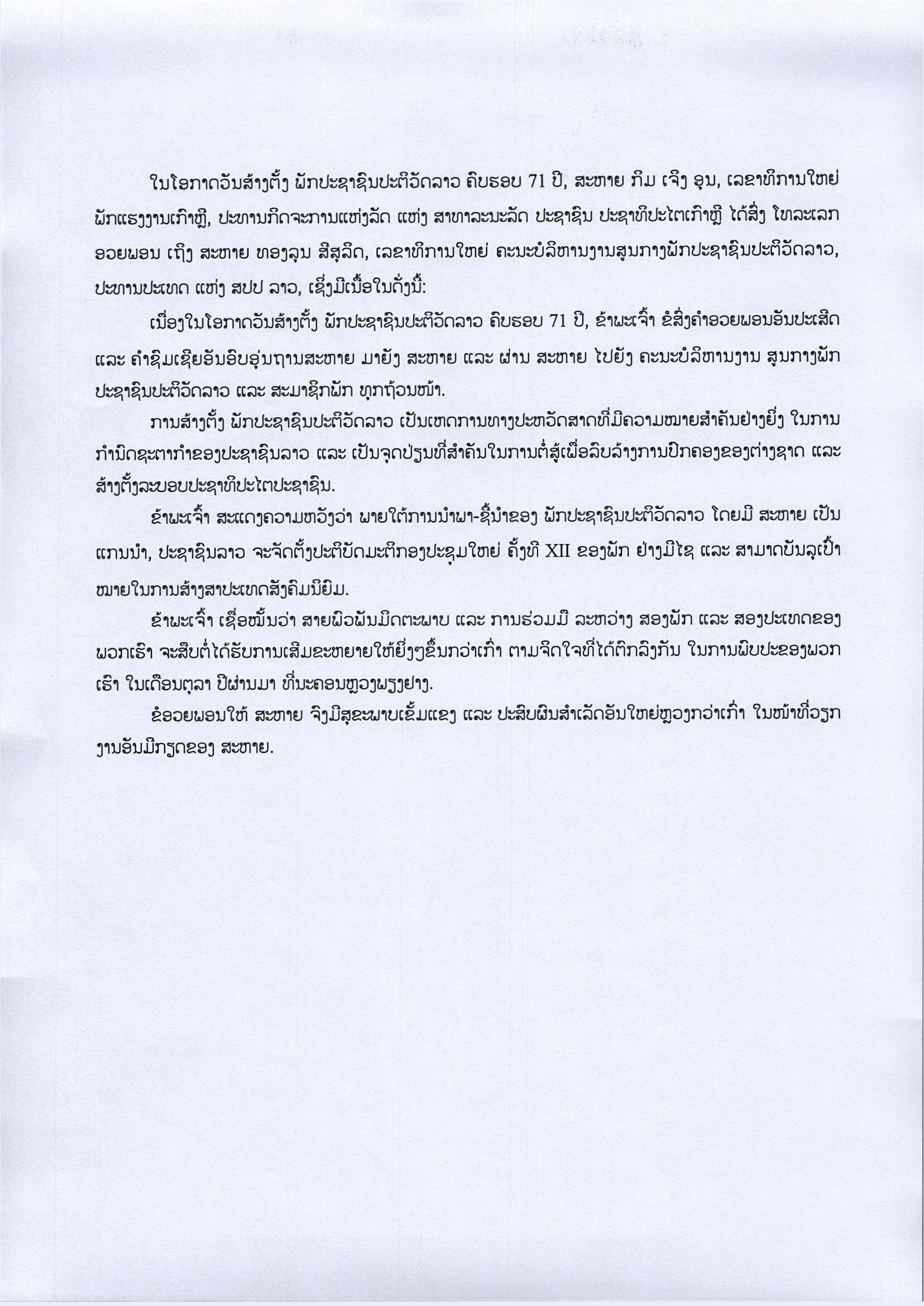 ພັກແຮງງານເກົາຫຼີ ສົ່ງສານອວຍພອນວັນສ້າງຕັ້ງພັກປະຊາຊົນປະຕິວັດລາວ